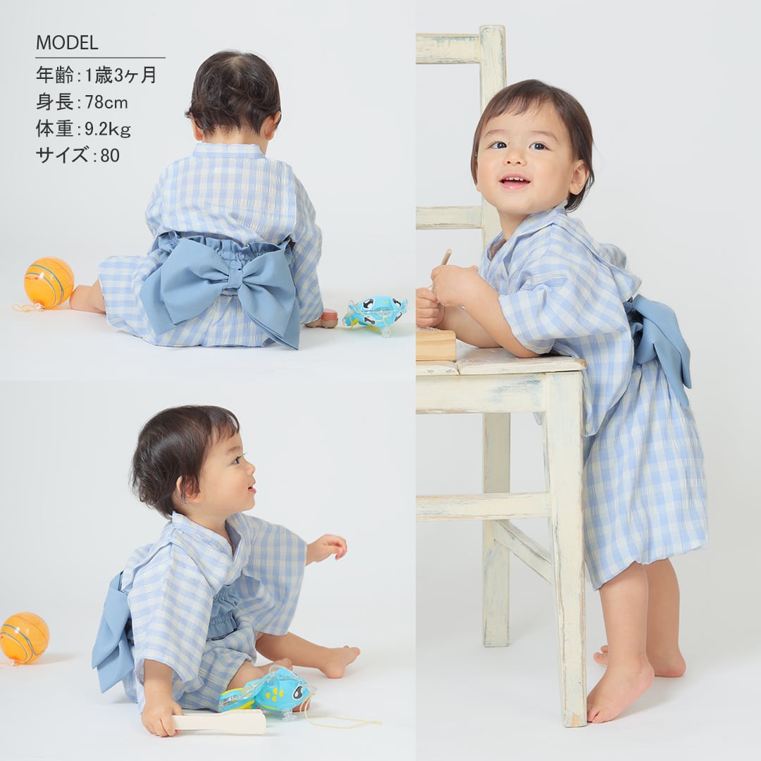 浴衣風甚平+帯の2点セットで簡単に着られるのが嬉しい。